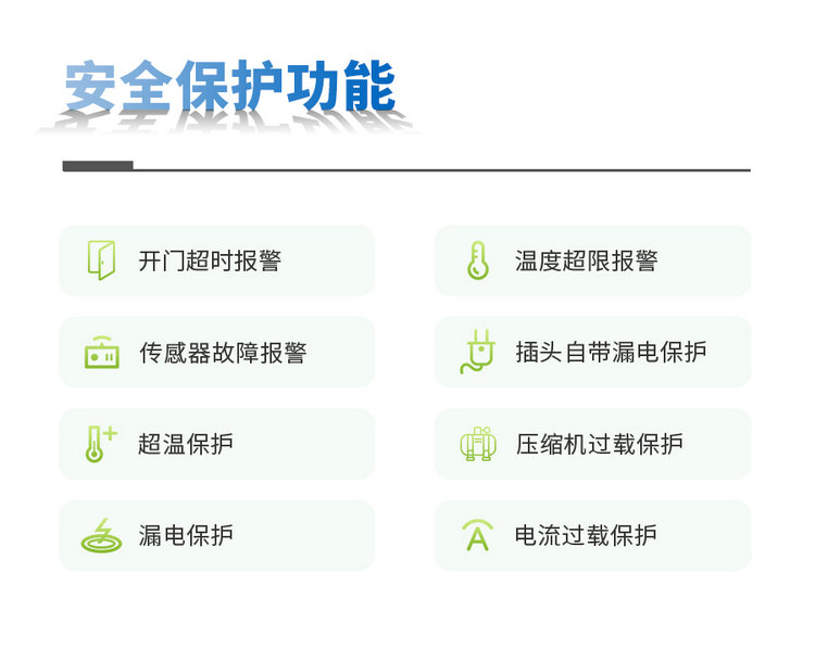 多項安全保護功能:具有開門超時報警、溫度超限報警、傳感器故障報警、漏電保護、超溫保護、壓縮機過載保護、電流過載保護等多項安全保護功能,保證儀器和樣品的安全。